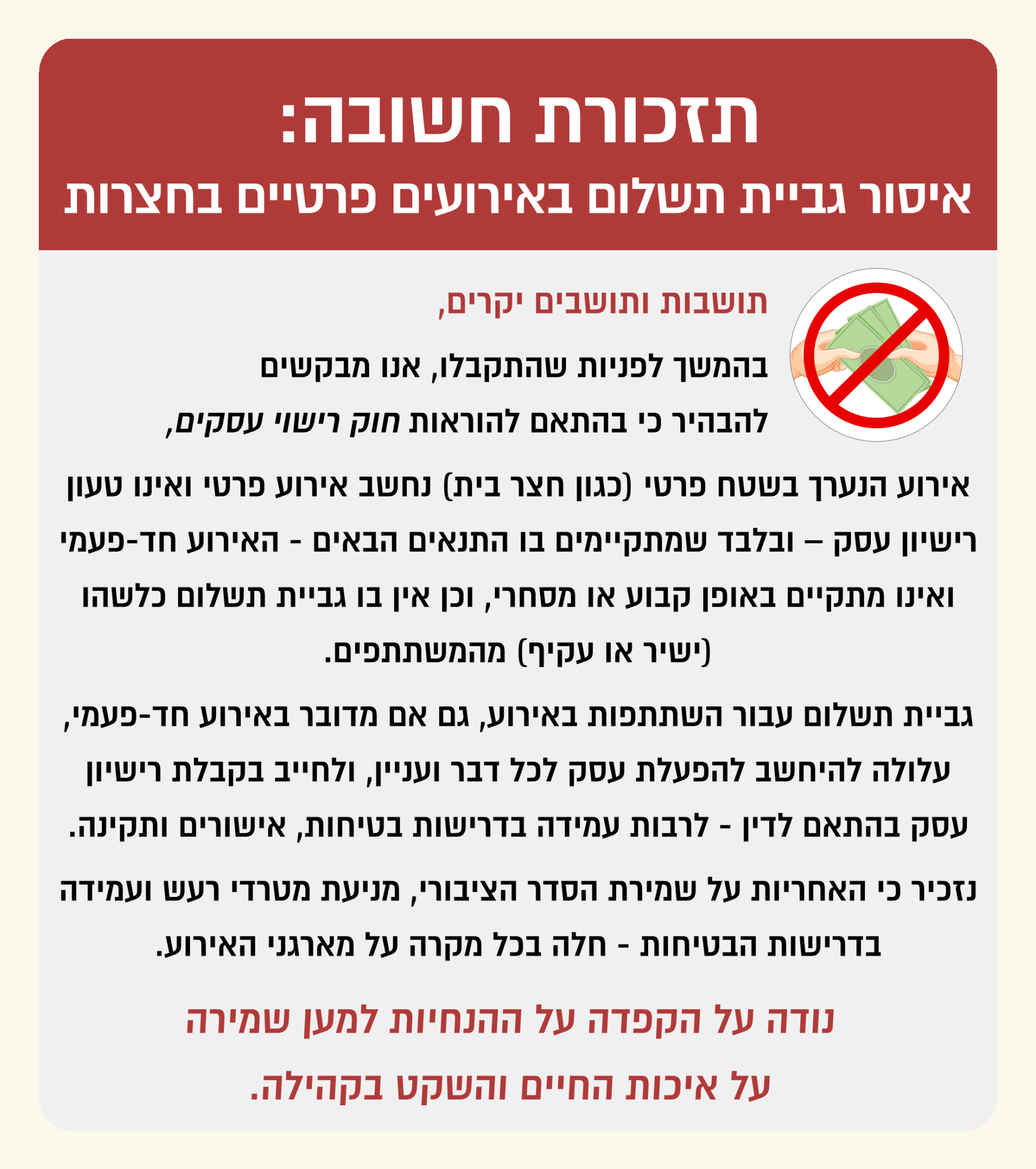 איסור גביית תשלום באירועים פרטיים וחצרות