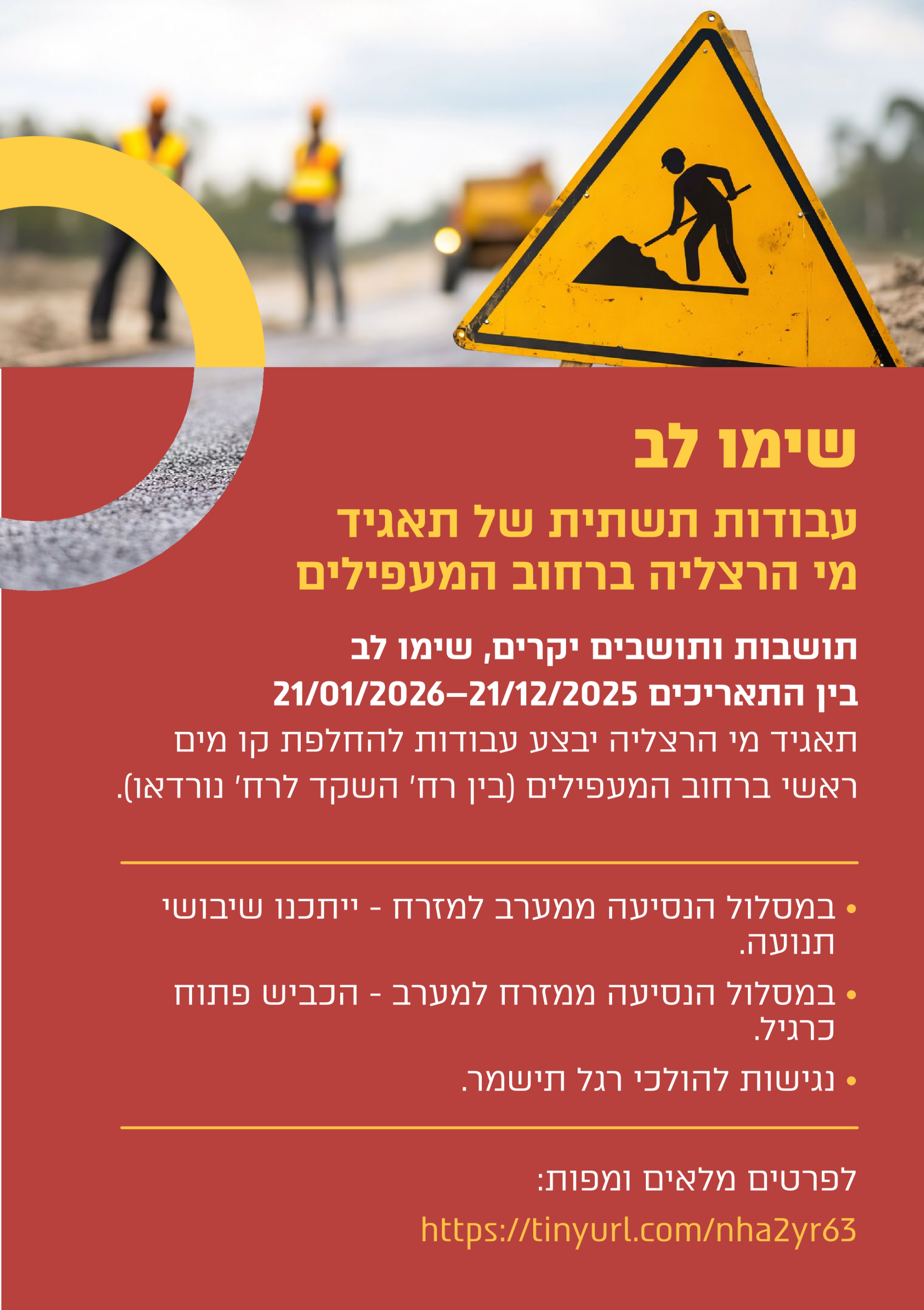 הסדרי תנועה זמניים ברחוב המעפילים בעקבות החלפת קו מים ראשי של העיר הרצליה