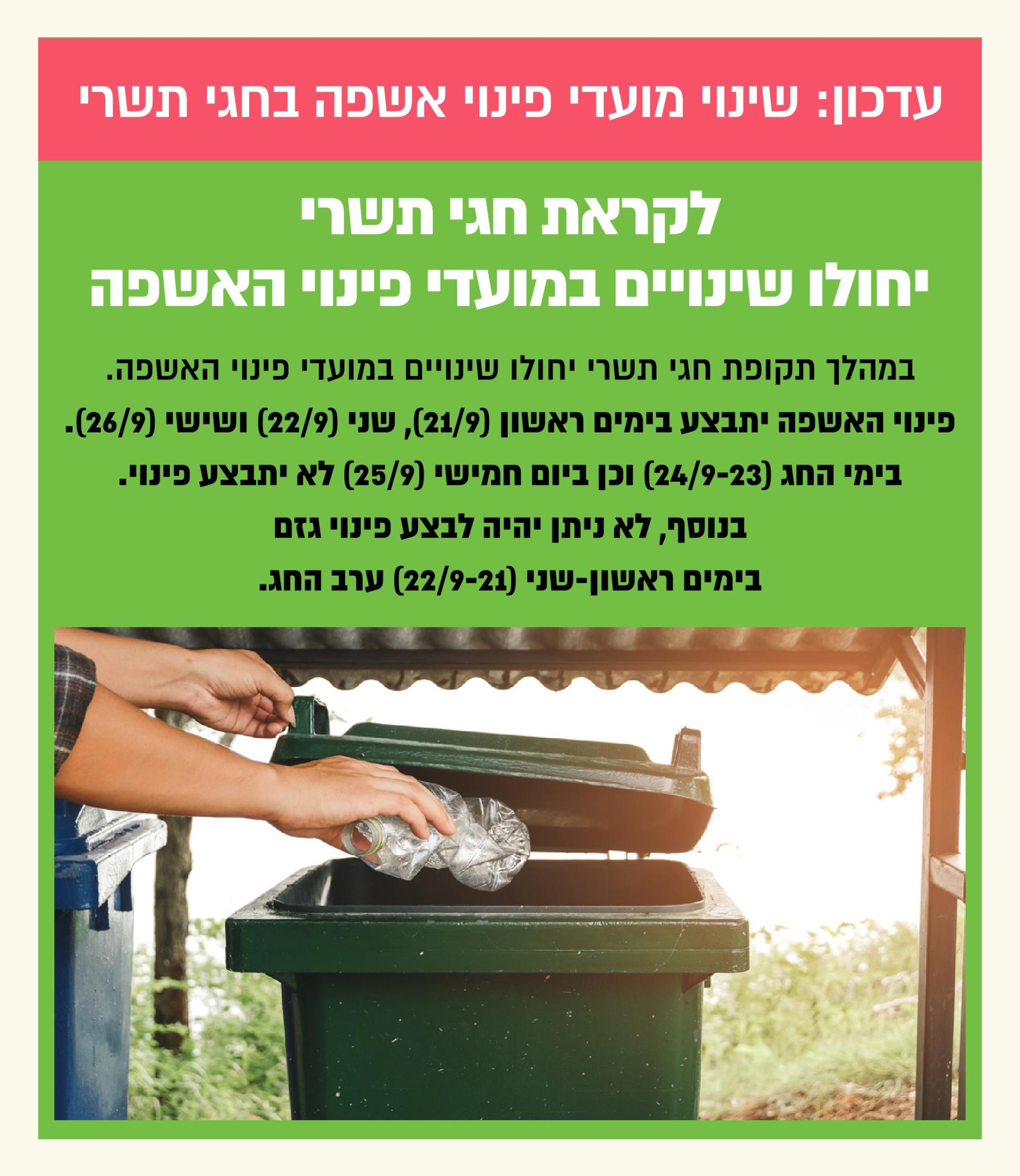 שינוי מועדי פינוי אשפה בחגי תשרי