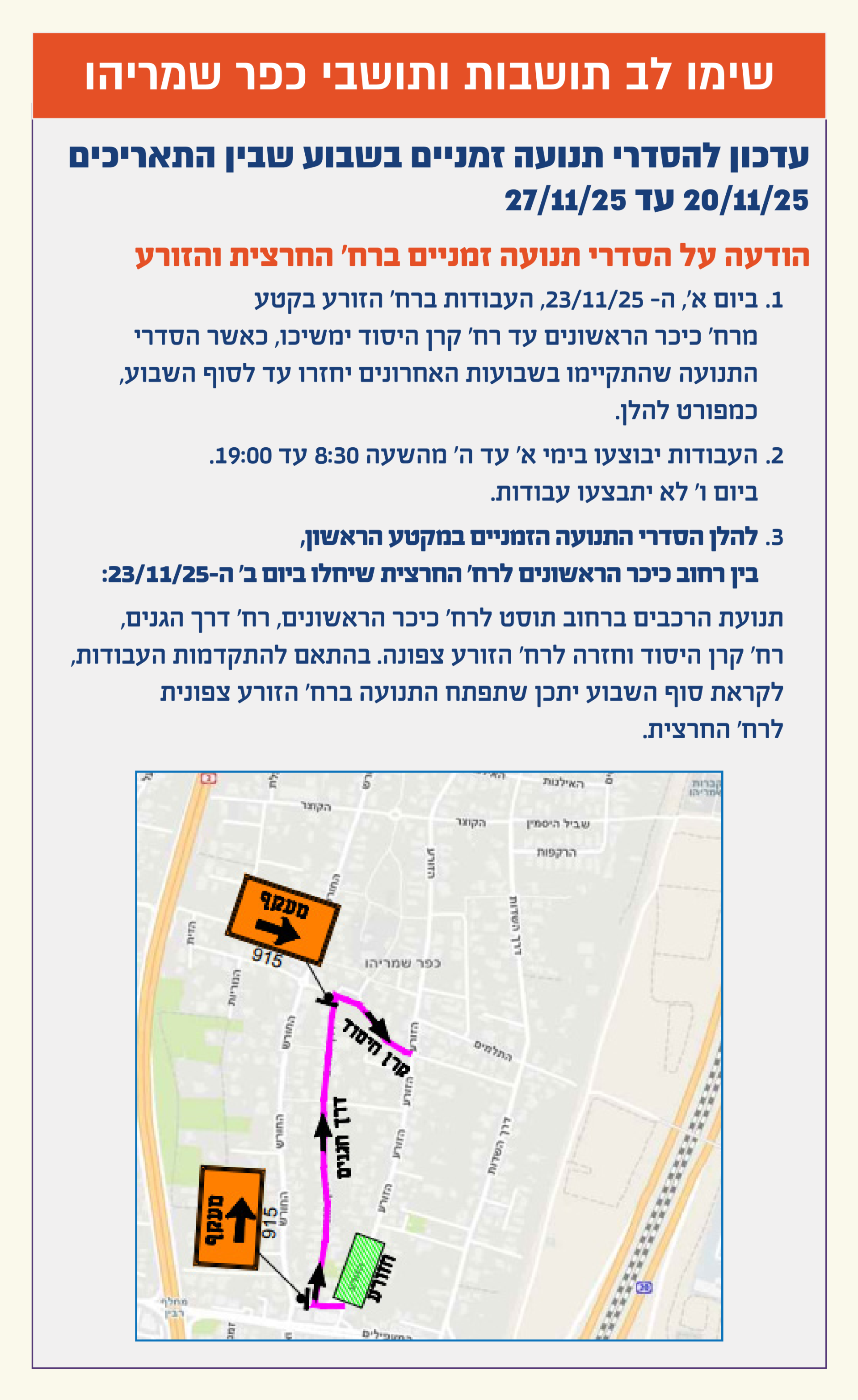 הסדרי תנועה זמניים בין התאריכים 20/11/25 עד 27/11/25