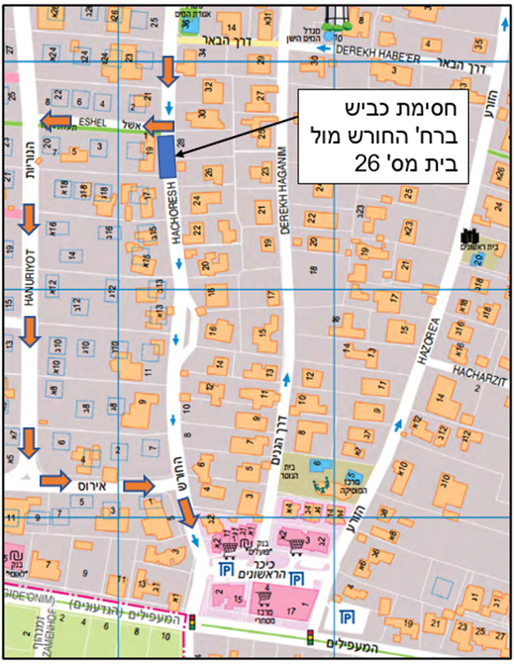 - ברח' החורש פינת רח' אשל: חסימה נקודתית מול בית מס' 26 והסתת התנועה שבאה מצפון לרח' האשל, רח' הנוריות ואירוס כמפורט להלן: